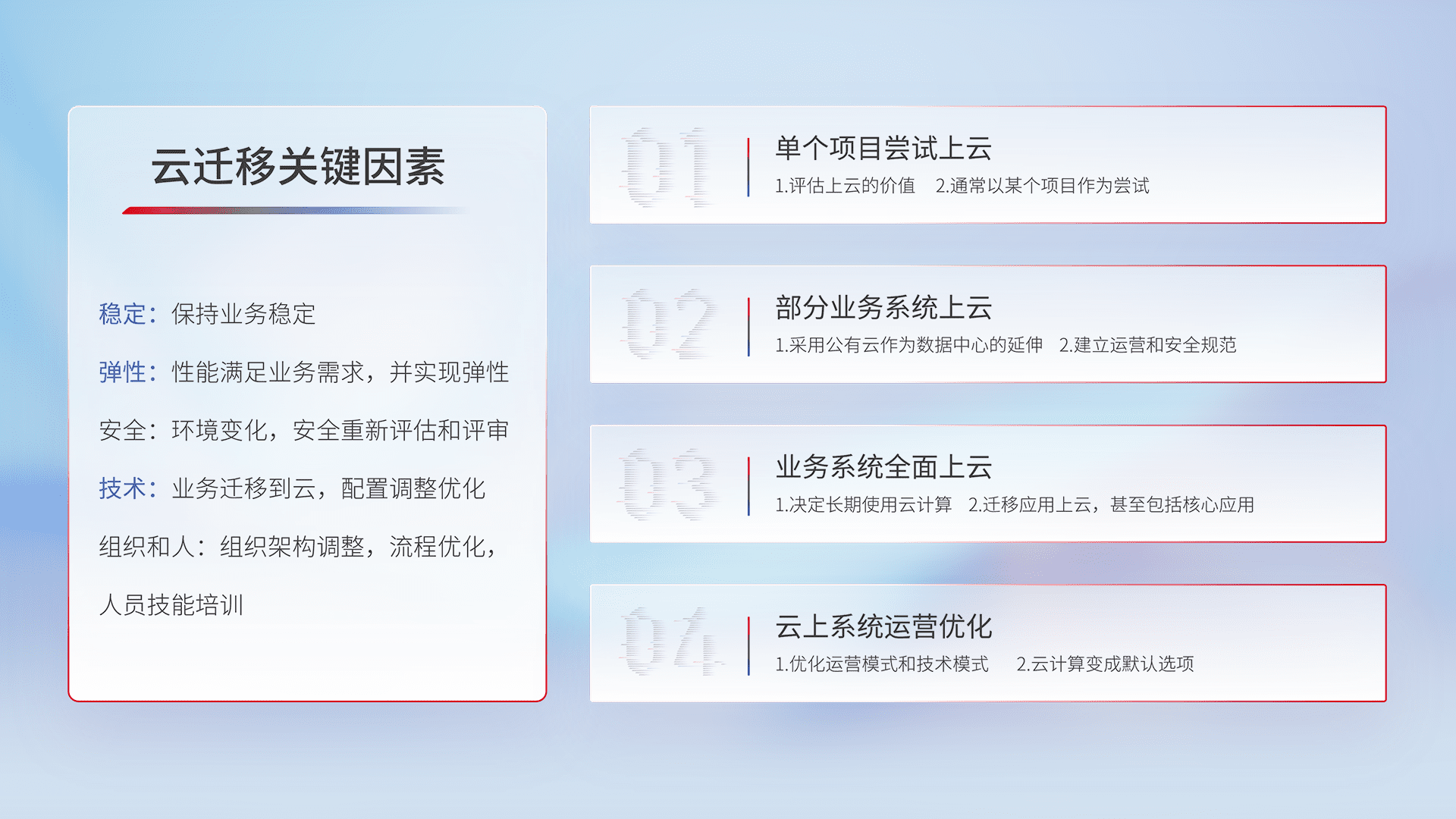 结合实际业务,,,从规划设计、、、、云平台选型、、、、云原生改造、、、数据迁移、、、集成交付,,迁移全过程为客户识别最佳上云路径,,做好风险识别管理,,,设计网络架构、、身份权限、、安全审计合规、、、操作审计、、、、日志审计、、监控告警策略、、、多站点容灾设计等,,,对云上基础设施进行整体规划,,,,提升IT治理水平,,以满足弹性、、、、高可用、、高性能的需求。。。